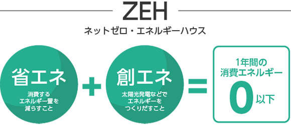 地球環境に優しい暮らしの実現に向けて、「住宅の省エネルギー化」が最重要課題のひとつになっています。2020 年に求められている省エネルギー基準よりも、さらに厳しいものが「ZEH基準」です。ZEHとは、高い「断熱」性能をベースに、高効率機器やHEMSによる「省エネ」、太陽光発電などによる「創エネ」を組み合わせることで、住まいの年間一次エネルギー消費量が正味おおむねゼロになる住まい。